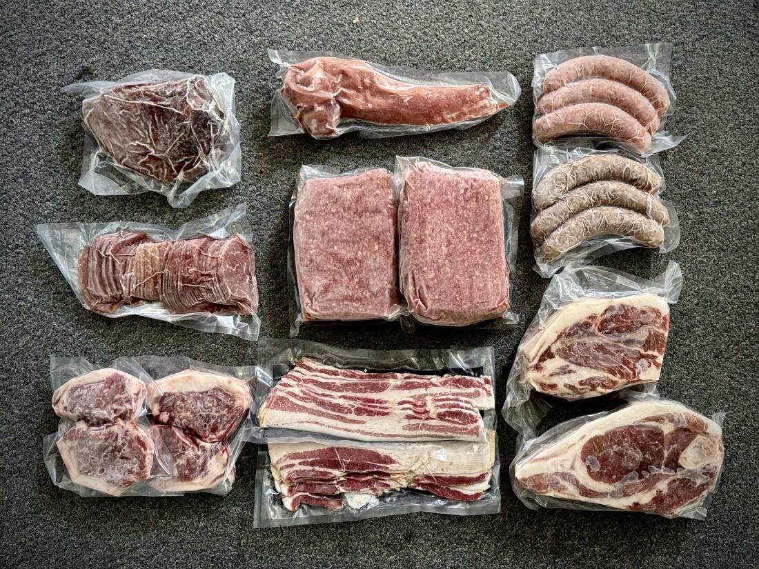 Une boîte pensée pour le réconfort de la saison : côtelettes, rôtis, haché, bacon, jambon, saucisses et plus encore.